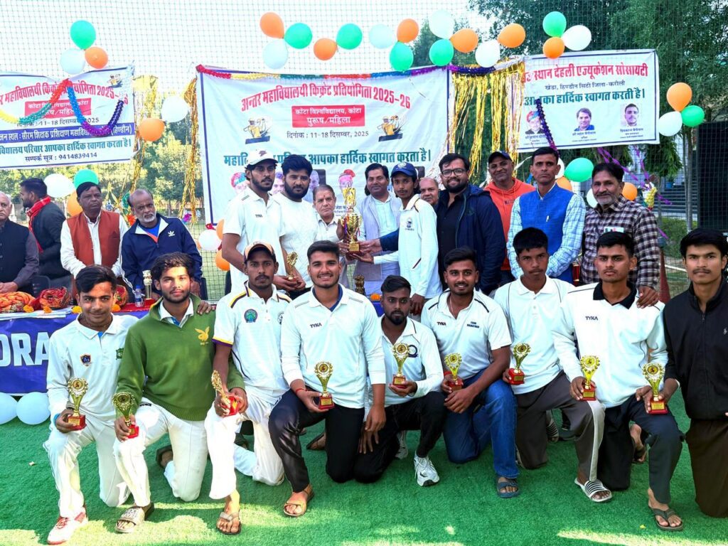 Kautilya College, Kota wins the Inter-College Cricket Tournament 2025 The final match of the Inter-College Cricket Tournament 2025, organized by Saurabh T.T. College located in Kheda, was highly thrilling, in which Kautilya College, Kota defeated Kota Government Arts College to claim the title. Batting first in the final match, Kautilya College, Kota scored 163 runs in the allotted overs. From the team, Yuvraj Meena played an excellent innings, scoring an unbeaten 86 runs and taking the team to a strong total. While chasing the target, the team of Kota Government Arts College could manage only 111 runs. From Kautilya College’s bowling side, Nikki Chauhan delivered an outstanding performance by taking 4 wickets, while Dinesh Bhatt took 2 wickets, keeping constant pressure on the opposing team. On the closing ceremony of the tournament, the Chairman of Saurabh T.T. College, Mahesh Beniwal, Sports In-charge Priyankant Beniwal, and Kota University cricket coach Ashish Yadav congratulated the winning and runner-up teams. The match was conducted in the presence of Kautilya College’s Sports Director Ayush Vashishth, coach Mayur Gojar, and Government Arts College coach Ravi Chaudhary. All the guests appreciated the players’ performances and wished them a bright future.